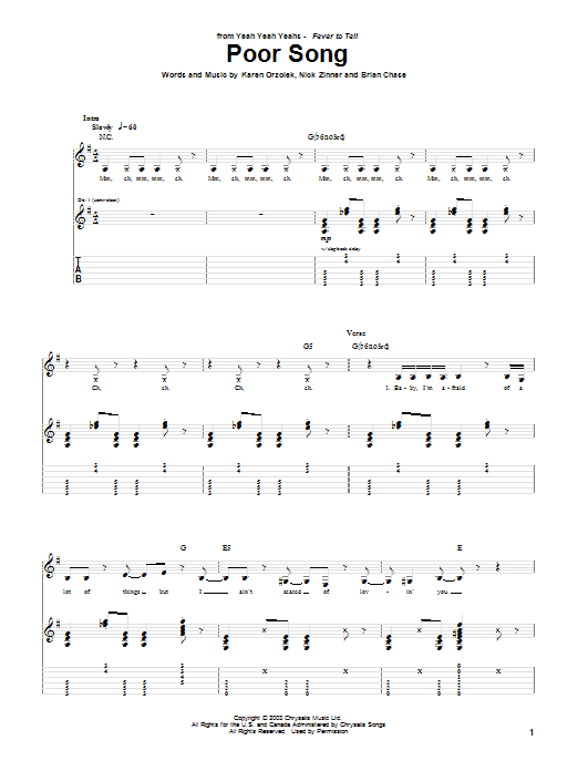 Download or print Yeah Yeah Yeahs Poor Song sheet music, chords and digital score arranged for Guitar Tab. This Pop score includes 4 page(s).