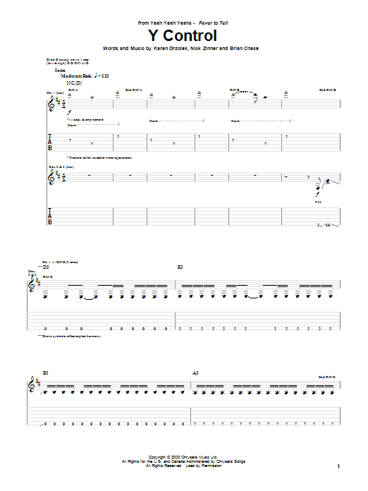 Download or print Yeah Yeah Yeahs Y Control sheet music, chords and digital score arranged for Guitar Tab. This Pop score includes 7 page(s).