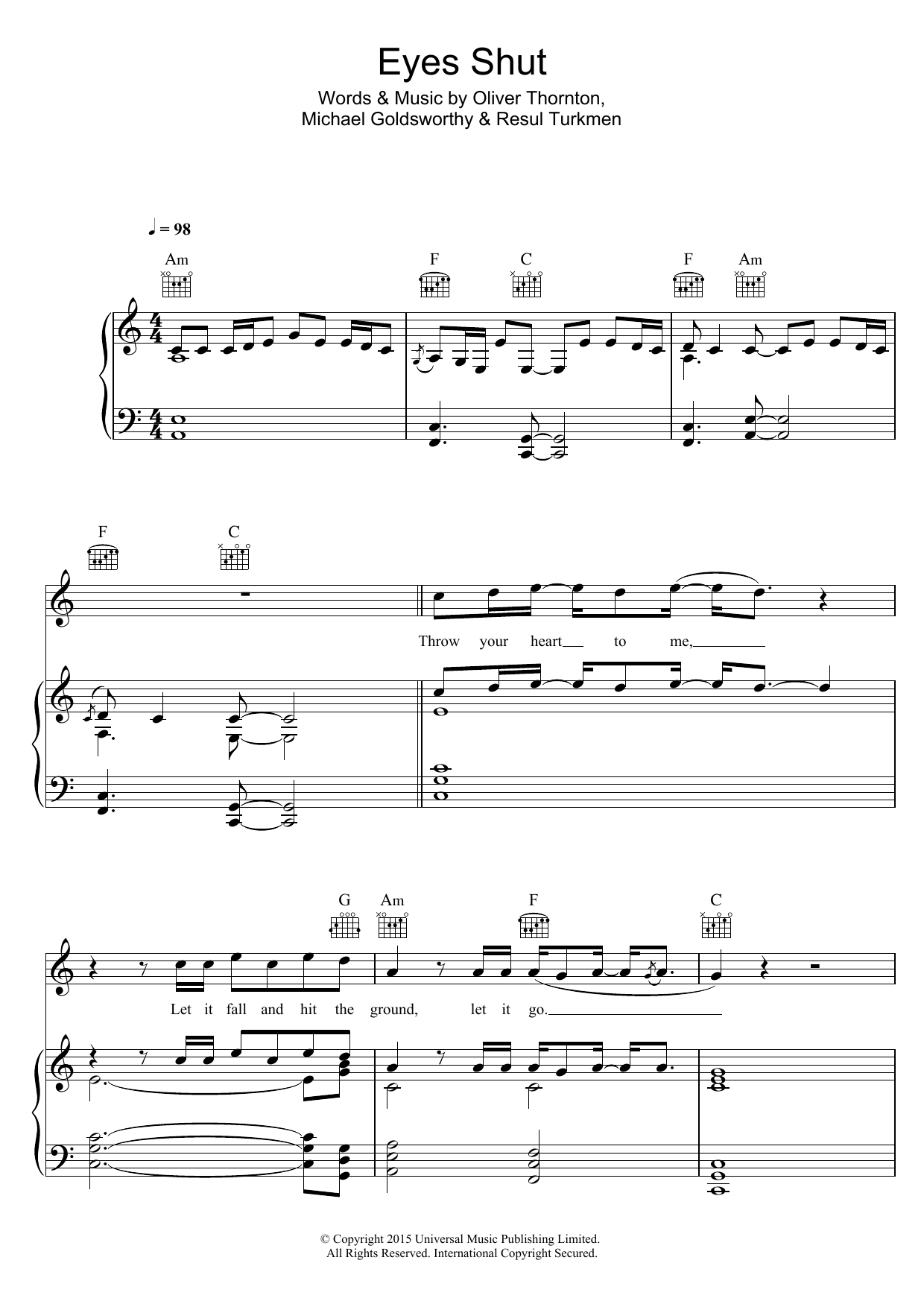 Download or print Years & Years Eyes Shut sheet music, chords and digital score arranged for Piano, Vocal & Guitar Chords. This Pop score includes 6 page(s).