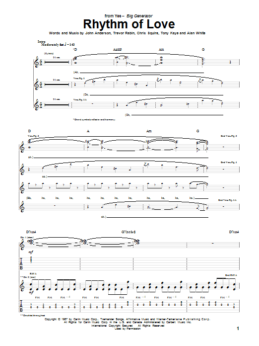 Download or print Yes Rhythm Of Love sheet music, chords and digital score arranged for Guitar Tab. This Pop score includes 9 page(s).