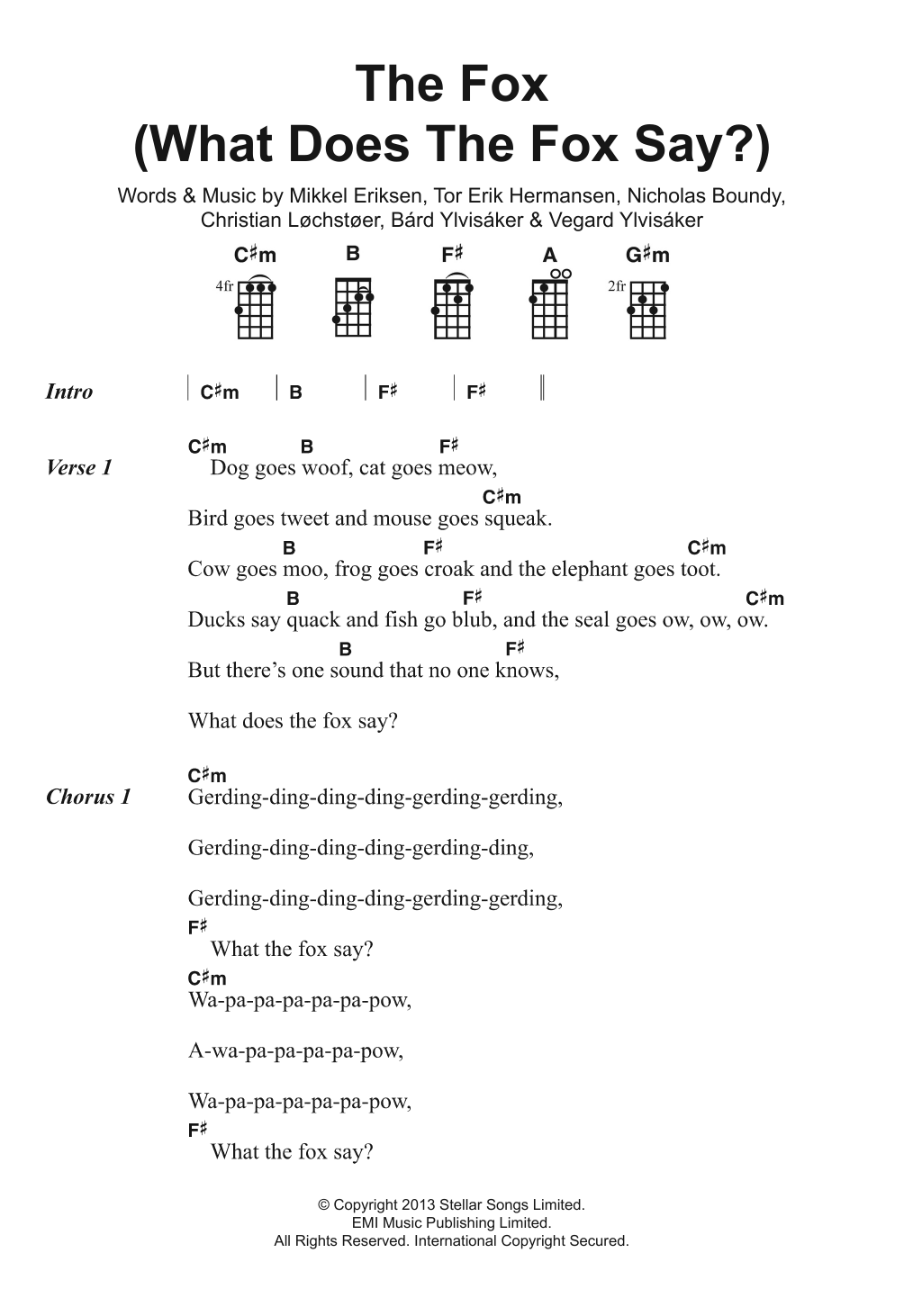 Download or print Ylvis The Fox (What Does The Fox Say?) sheet music, chords and digital score arranged for Ukulele Chords/Lyrics. This Pop score includes 3 page(s).
