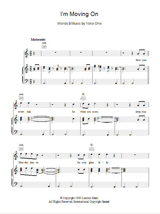 Download or print Yoko Ono I'm Moving On sheet music, chords and digital score arranged for Piano, Vocal & Guitar Chords. This Pop score includes 5 page(s).