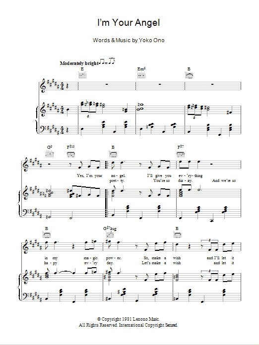 Download or print Yoko Ono I'm Your Angel sheet music, chords and digital score arranged for Piano, Vocal & Guitar Chords. This Pop score includes 4 page(s).