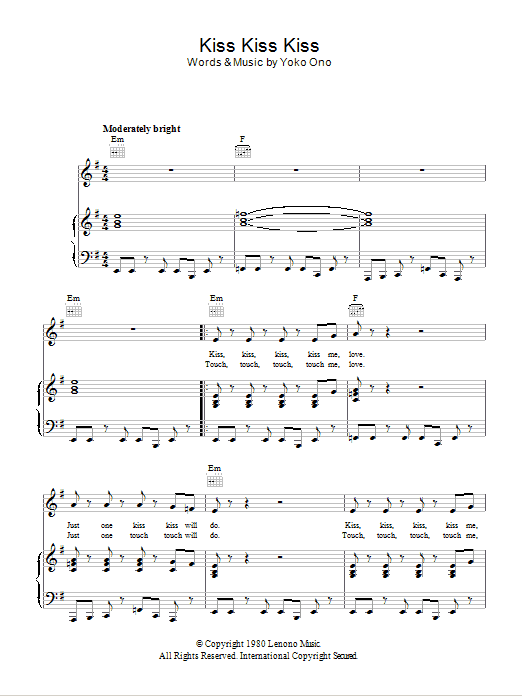 Download or print Yoko Ono Kiss, Kiss, Kiss sheet music, chords and digital score arranged for Piano, Vocal & Guitar Chords. This Pop score includes 3 page(s).