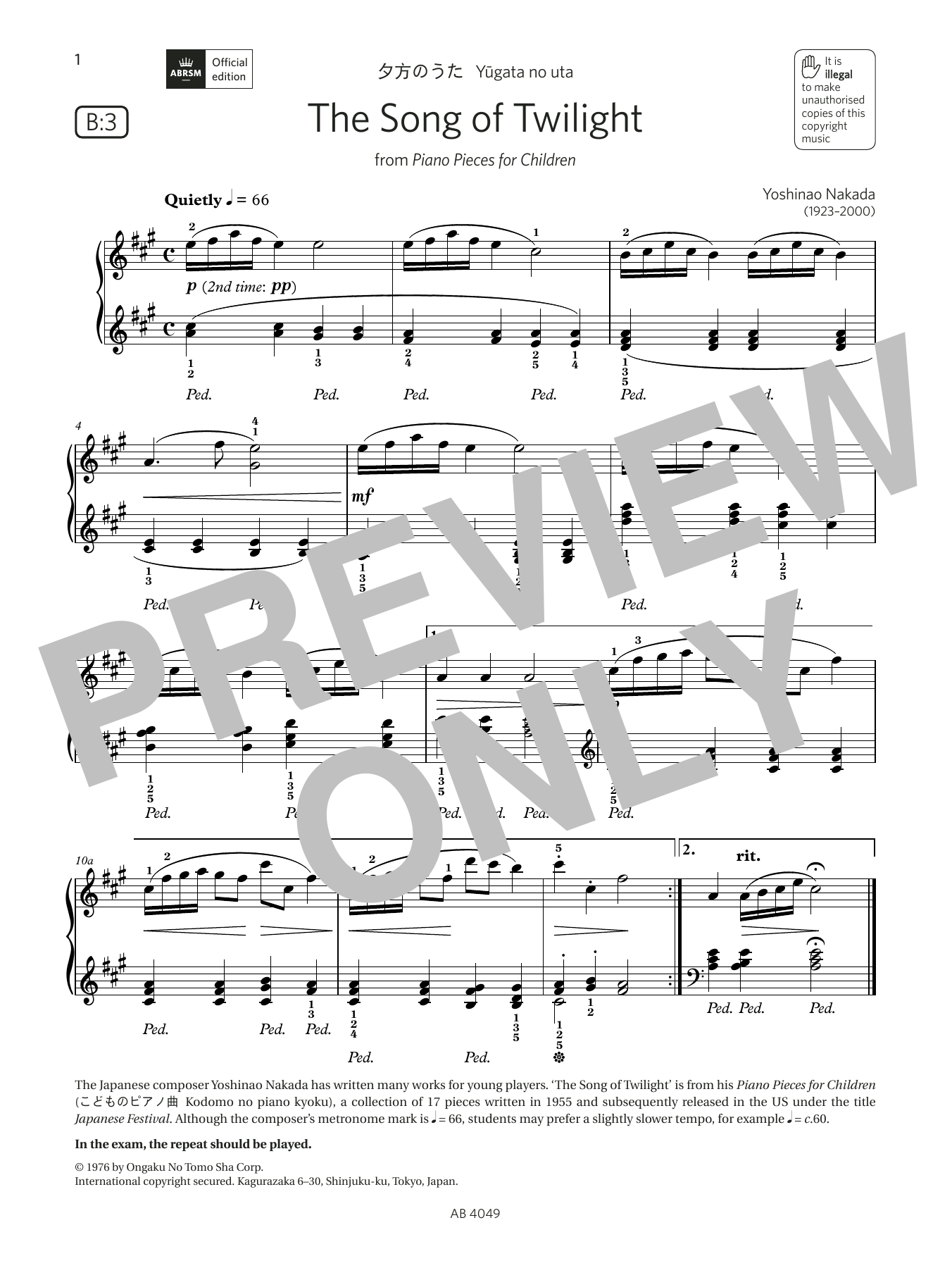 Download or print Yoshinao Nakada The Song of Twilight (Grade 3, list B3, from the ABRSM Piano Syllabus 2023 & 2024) sheet music, chords and digital score arranged for Piano Solo. This Classical score includes 1 page(s).