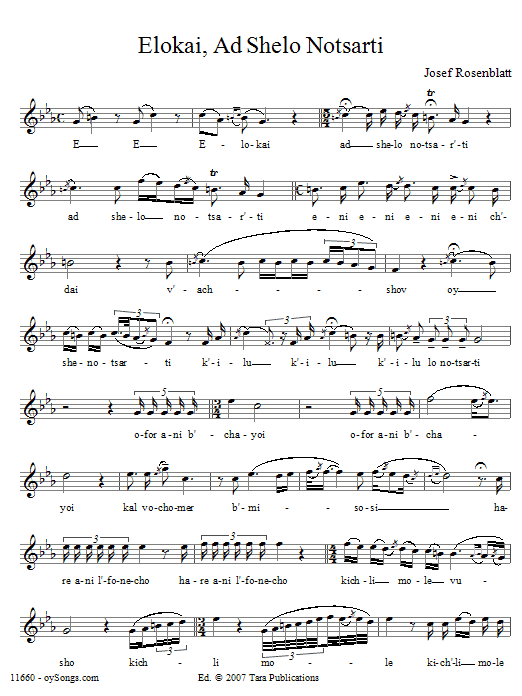 Download or print Yossele Rosenblatt Elokai Ad Shelo Notsarti sheet music, chords and digital score arranged for Piano & Vocal. This Traditional score includes 2 page(s).