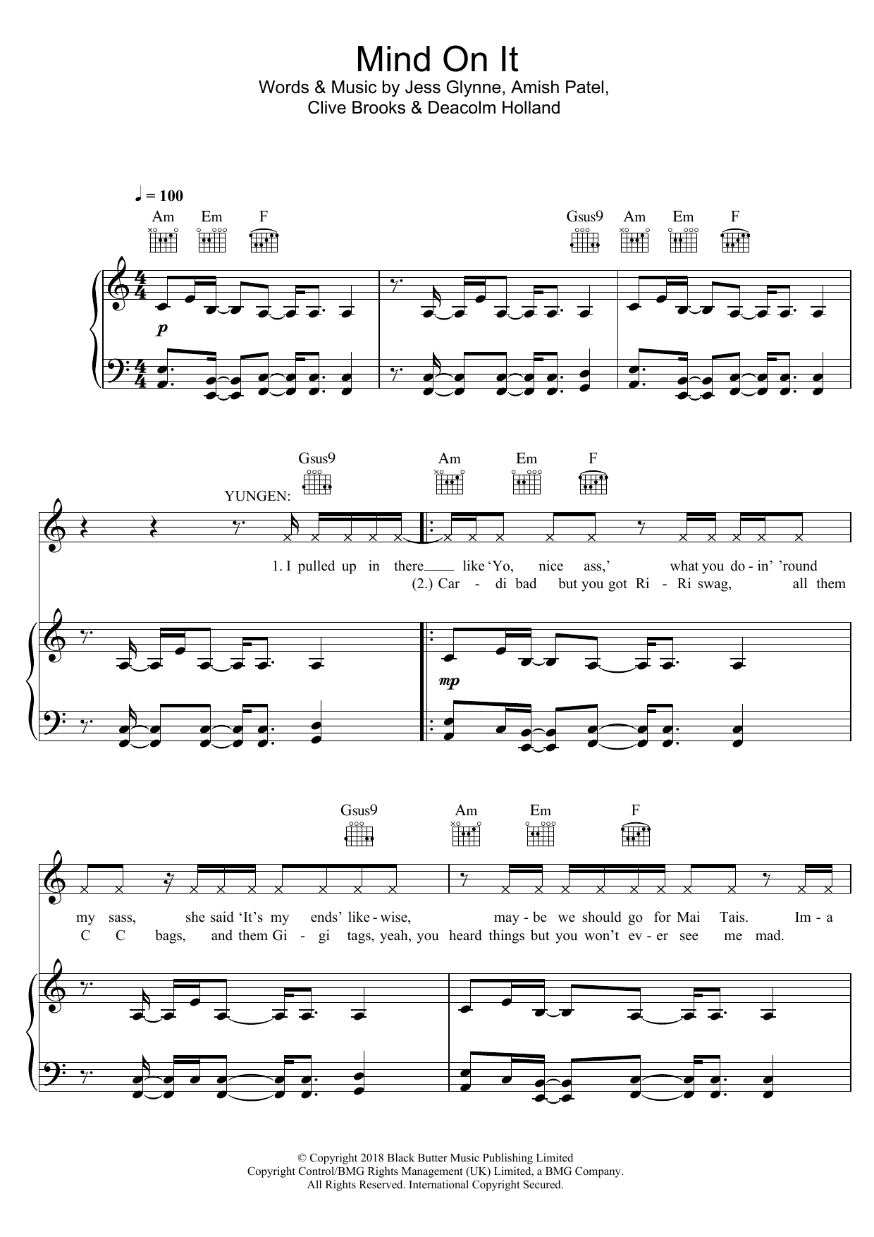 Download or print Yungen Mind On It (featuring Jess Glynne) sheet music, chords and digital score arranged for Piano, Vocal & Guitar Chords. This Pop score includes 6 page(s).
