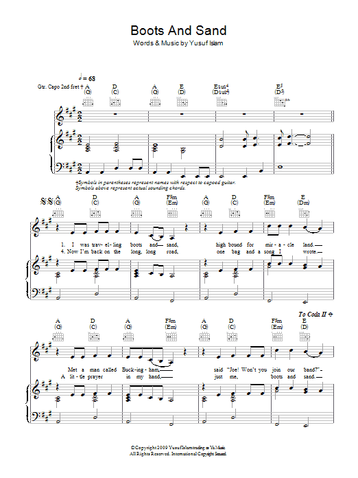 Download or print Yusuf Islam Boots And Sand sheet music, chords and digital score arranged for Piano, Vocal & Guitar Chords. This Folk score includes 6 page(s).