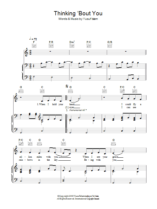 Download or print Yusuf Islam Thinking 'Bout You sheet music, chords and digital score arranged for Piano, Vocal & Guitar Chords. This Folk score includes 5 page(s).