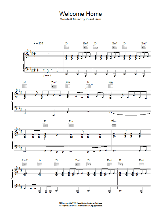 Download or print Yusuf Islam Welcome Home sheet music, chords and digital score arranged for Piano, Vocal & Guitar Chords. This Folk score includes 6 page(s).