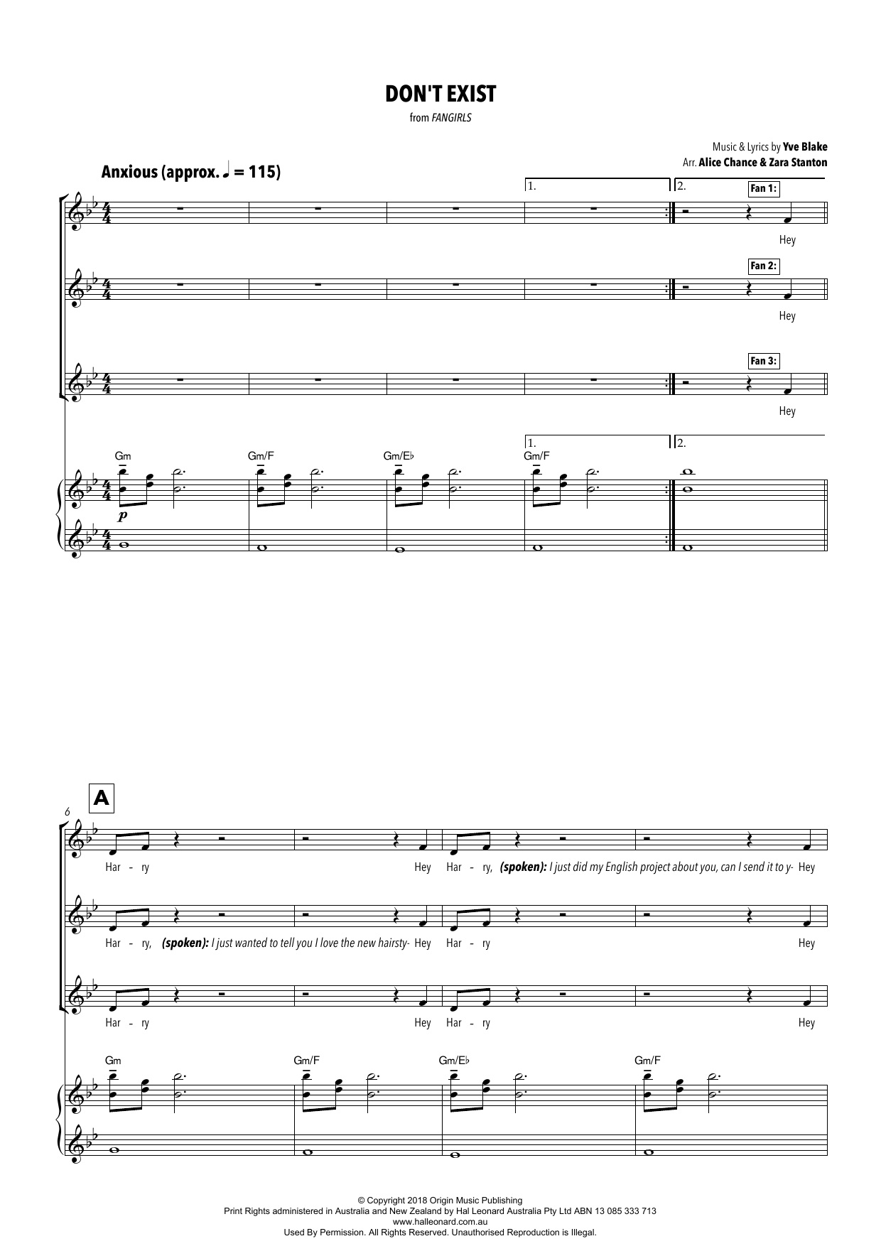 Quick facts Don't Exist (from Fangirls) (arr. Alice Chance and Zara Stanton) about digital sheet music