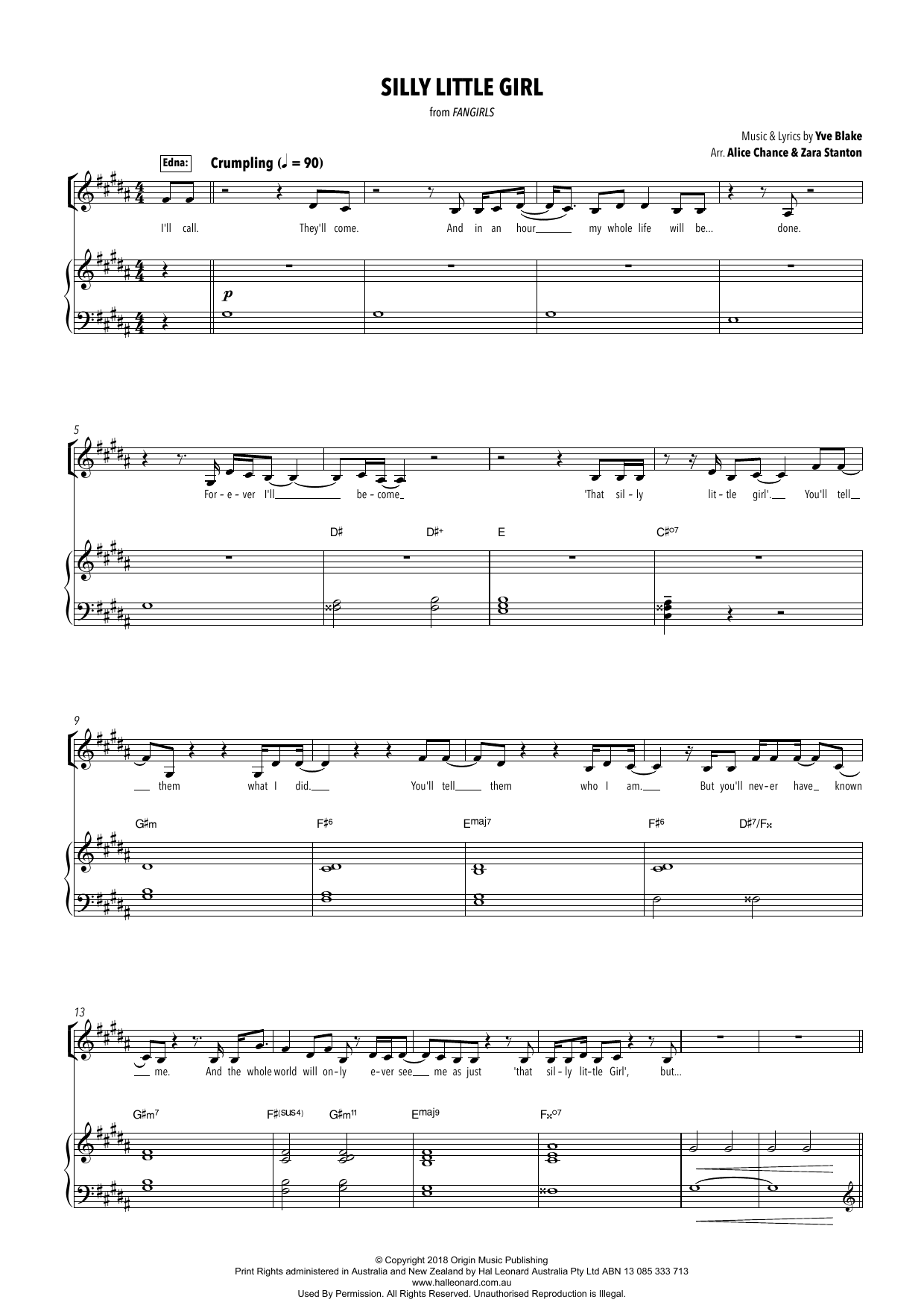 Download or print Yve Blake Silly Little Girl (from Fangirls) (arr. Alice Chance and Zara Stanton) sheet music, chords and digital score arranged for Piano & Vocal. This Musical/Show score includes 5 page(s).
