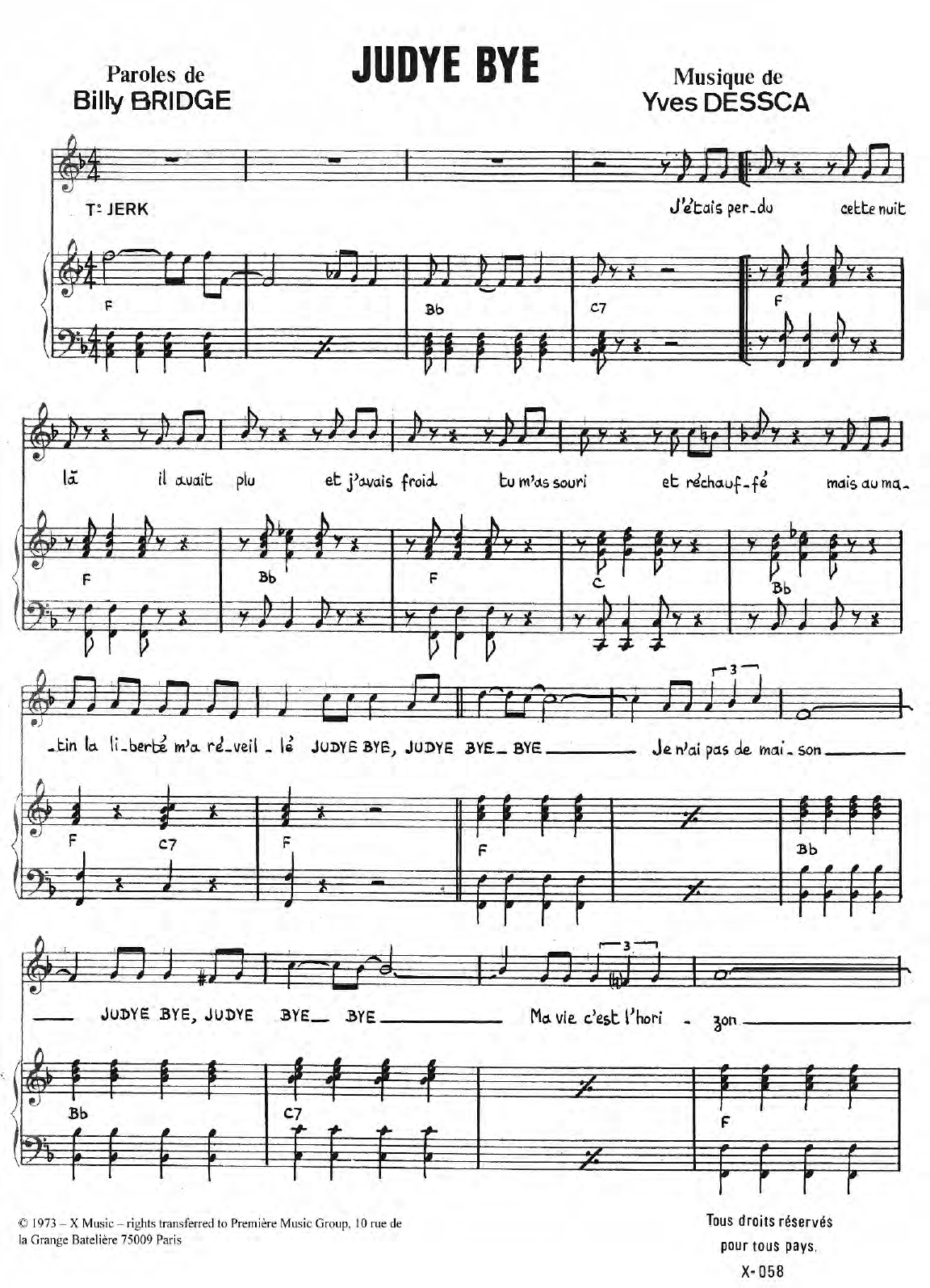 Download or print Yves Heuze Judy Bye sheet music, chords and digital score arranged for Piano & Vocal. This Pop score includes 2 page(s).