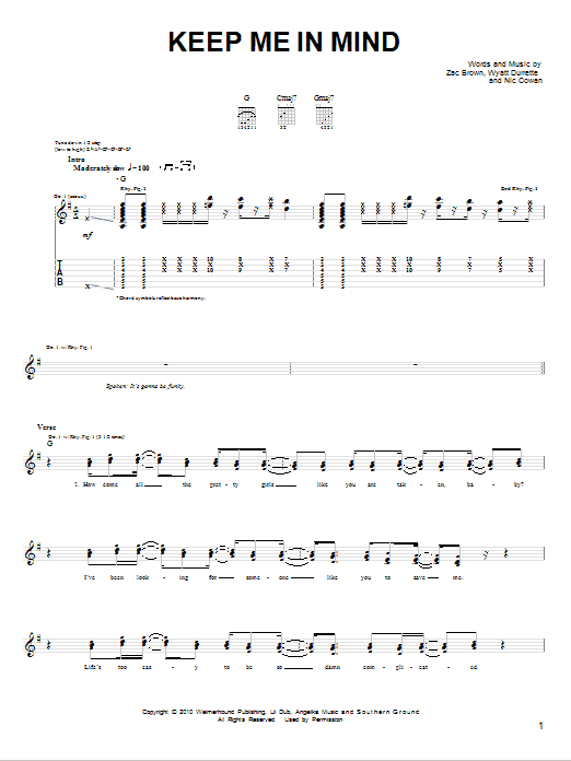 Download or print Zac Brown Band Keep Me In Mind sheet music, chords and digital score arranged for Piano, Vocal & Guitar Chords (Right-Hand Melody). This Country score includes 8 page(s).