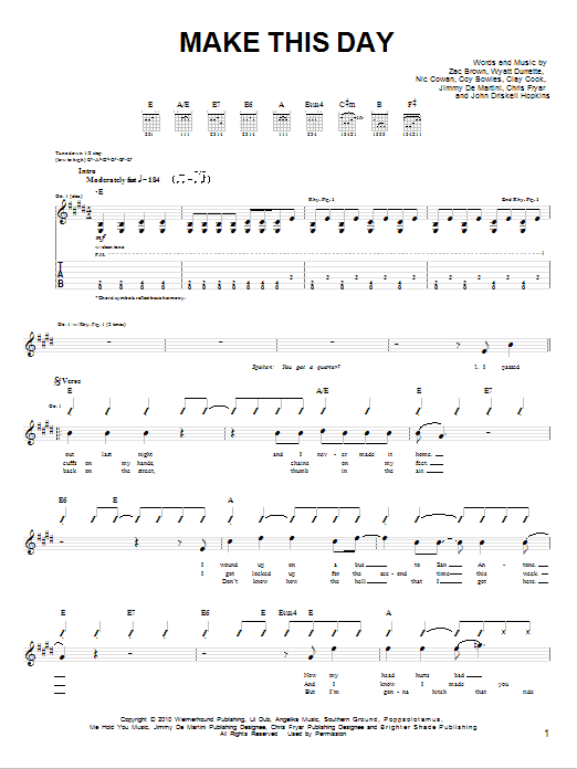 Download or print Zac Brown Band Make This Day sheet music, chords and digital score arranged for Piano, Vocal & Guitar Chords (Right-Hand Melody). This Country score includes 8 page(s).