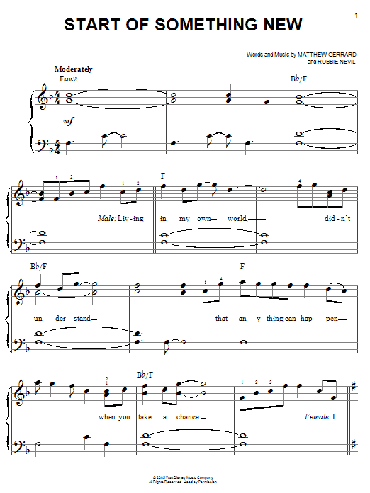 Download or print High School Musical Start Of Something New sheet music, chords and digital score arranged for Piano Solo. This Children score includes 5 page(s).