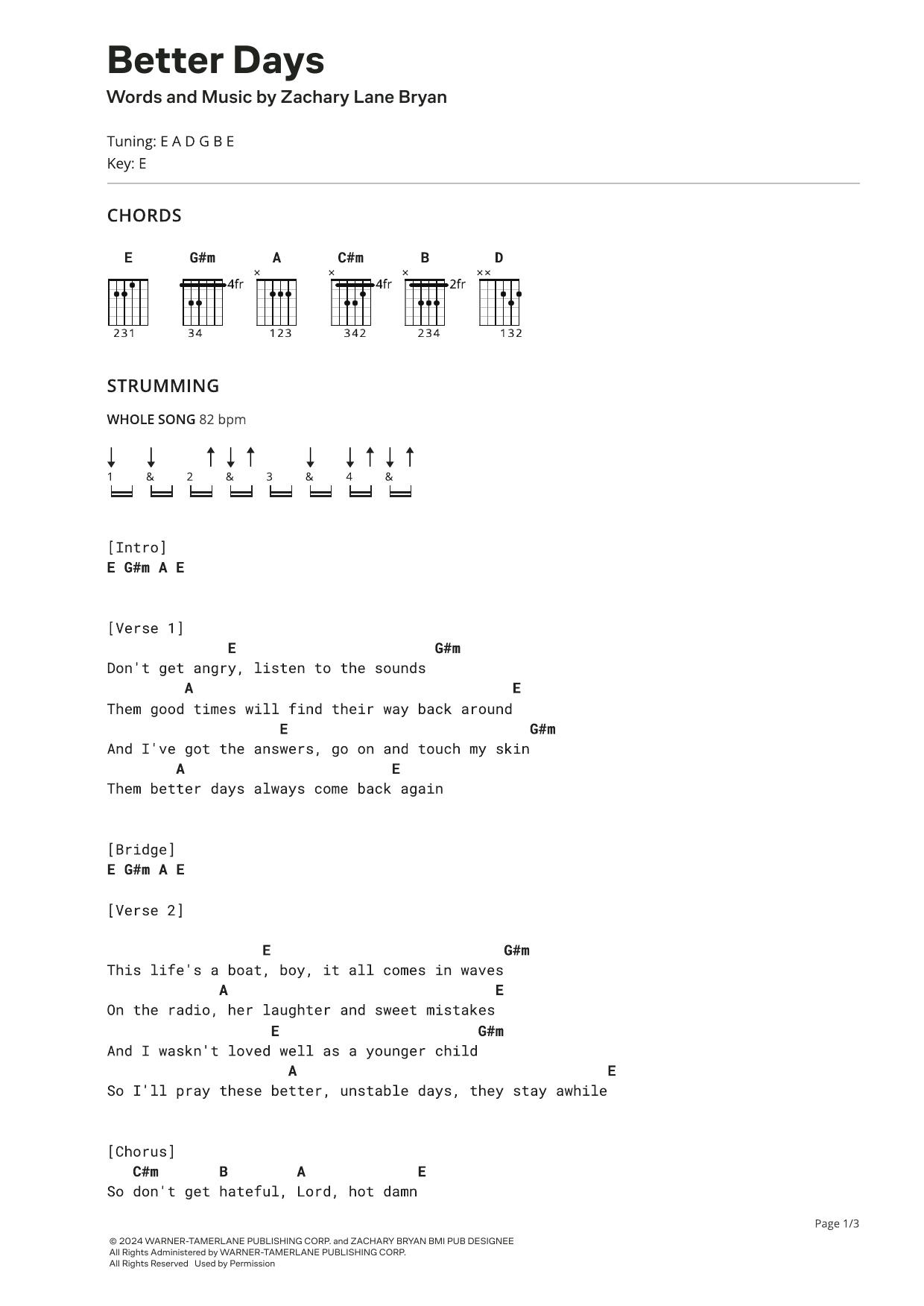 Download or print Zach Bryan Better Days (feat. John Mayer) sheet music, chords and digital score arranged for Ultimate Guitar. This Country score includes 3 page(s).
