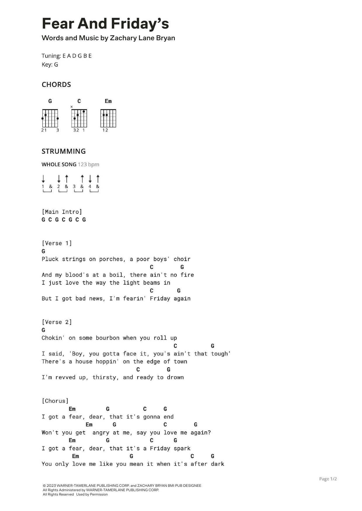 Download or print Zach Bryan Fear And Friday's sheet music, chords and digital score arranged for Ultimate Guitar. This Country score includes 2 page(s).