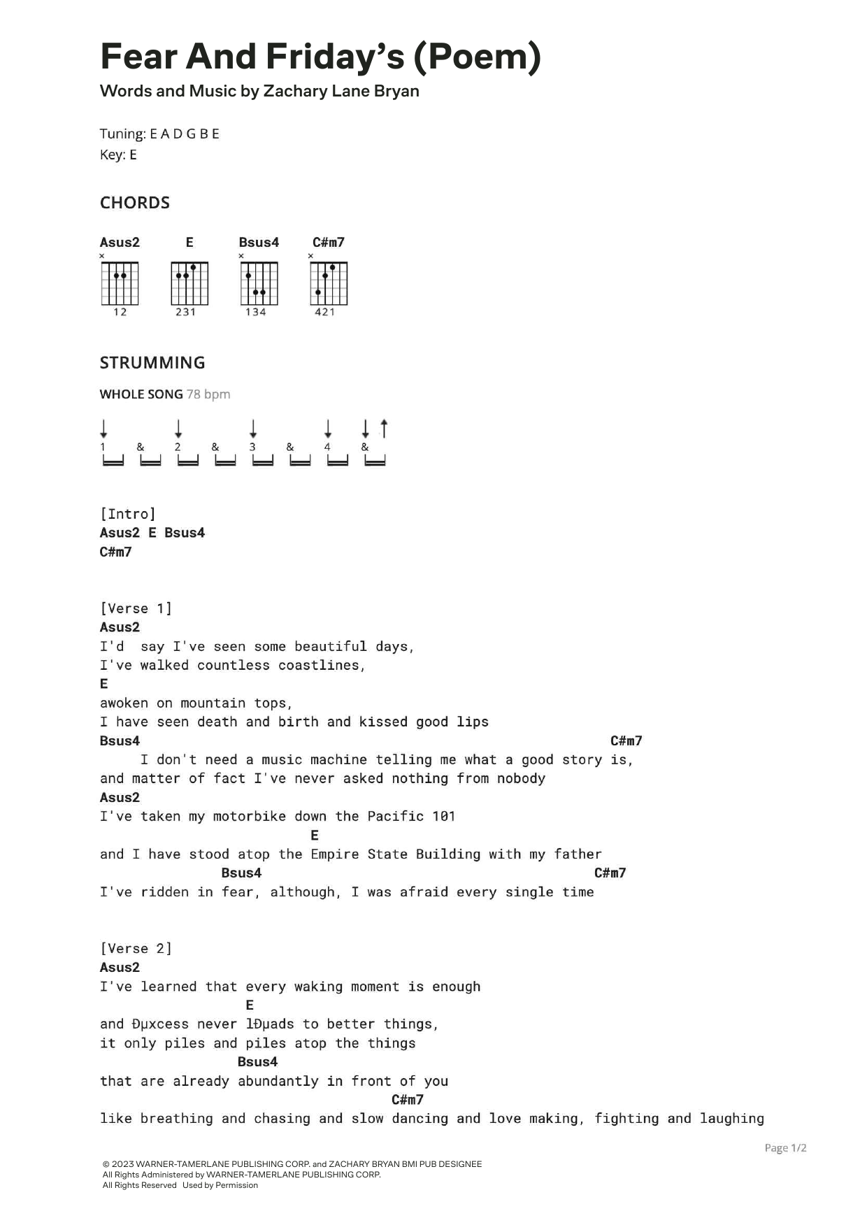 Download or print Zach Bryan Fear and Friday's (Poem) sheet music, chords and digital score arranged for Ultimate Guitar. This Country score includes 2 page(s).