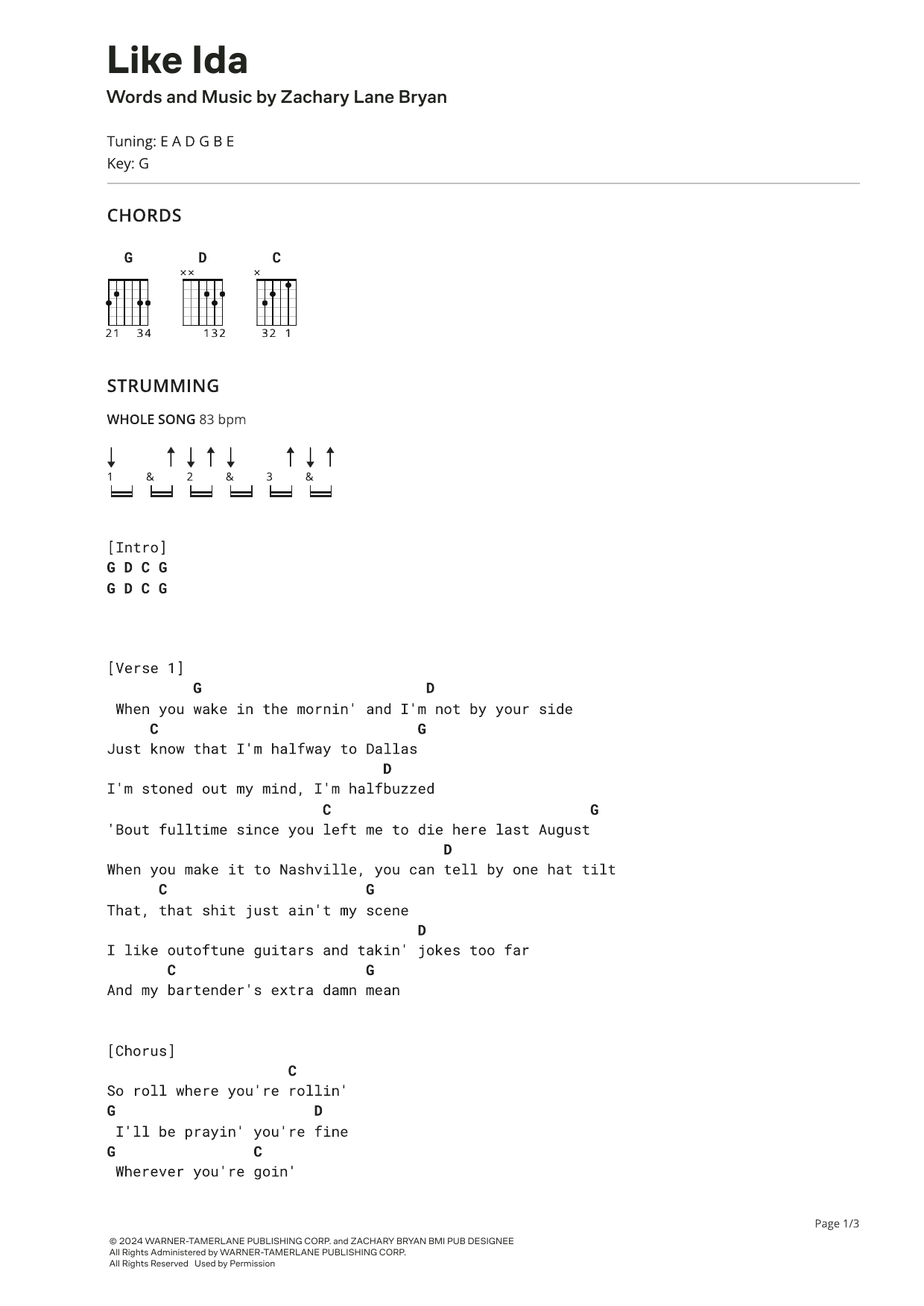 Download or print Zach Bryan Like Ida sheet music, chords and digital score arranged for Ultimate Guitar. This Country score includes 3 page(s).