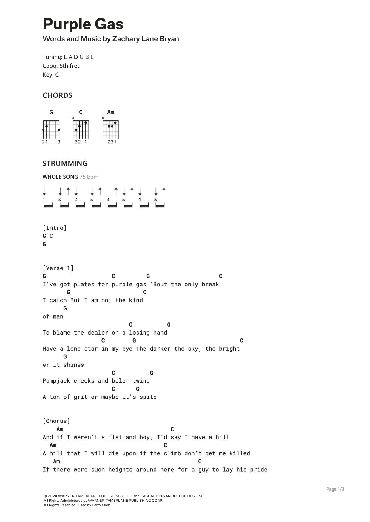 Download or print Zach Bryan & Noeline Hoffman Purple Gas sheet music, chords and digital score arranged for Ultimate Guitar. This Country score includes 3 page(s).
