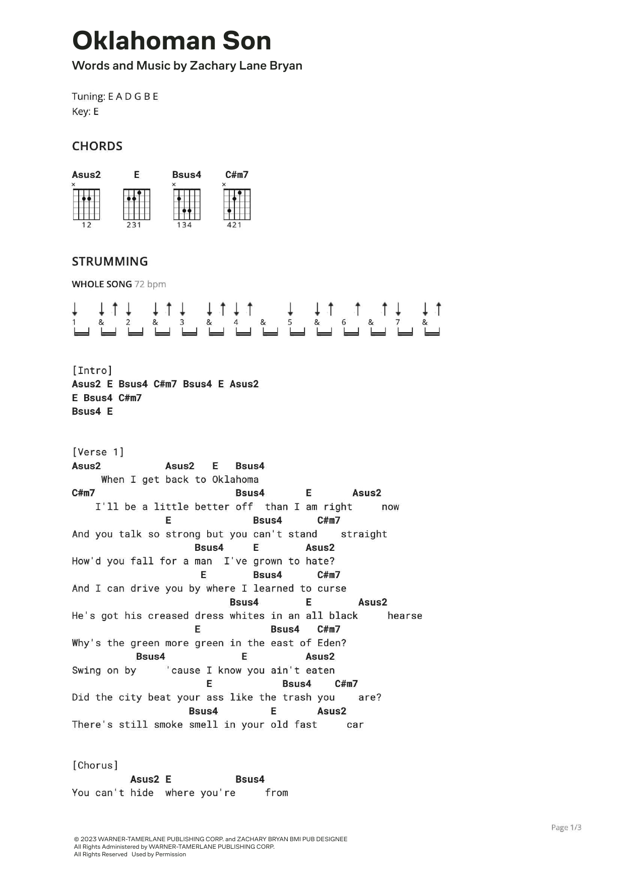 Download or print Zach Bryan Oklahoman Son sheet music, chords and digital score arranged for Ultimate Guitar. This Country score includes 3 page(s).