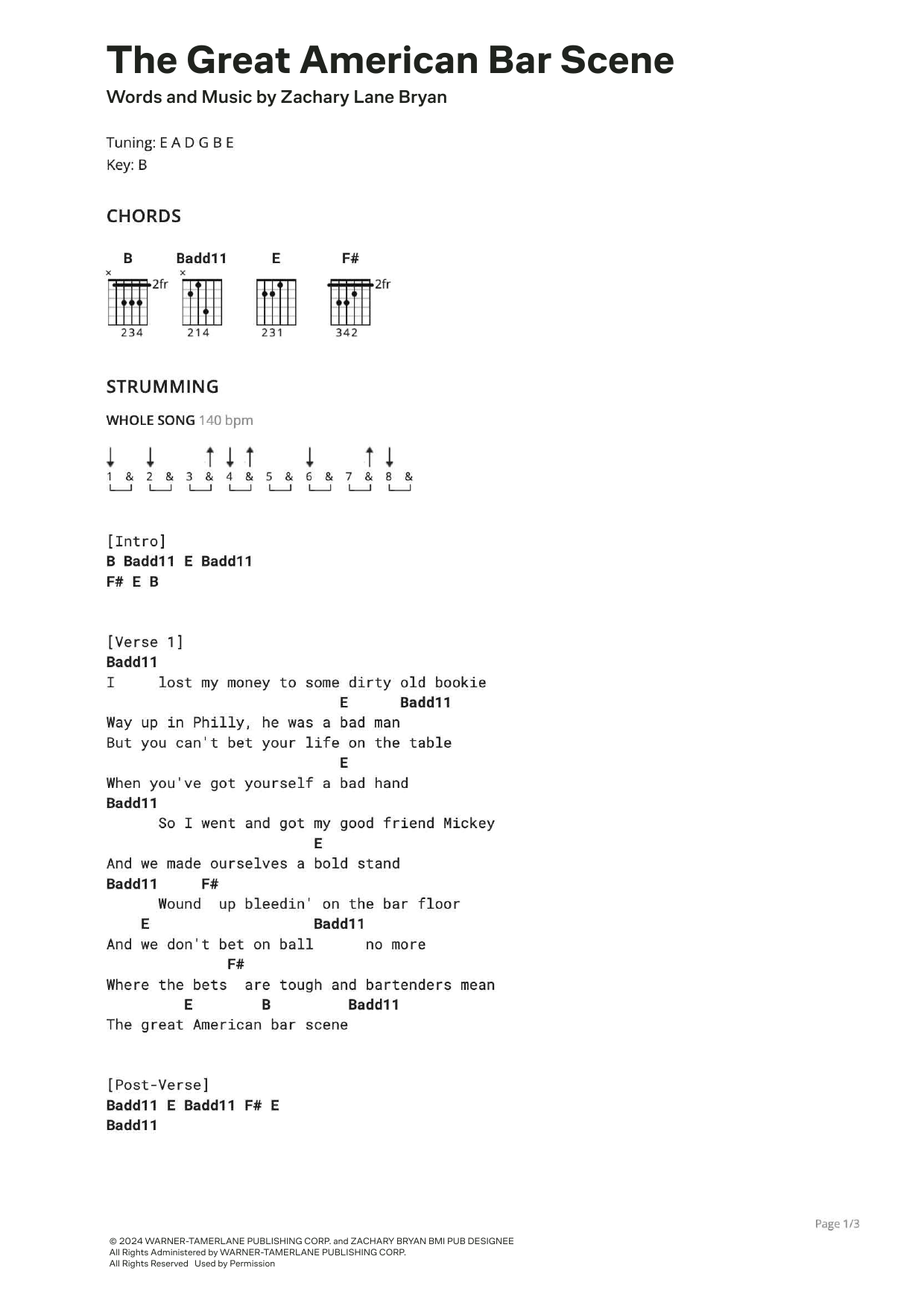 Download or print Zach Bryan The Great American Bar Scene sheet music, chords and digital score arranged for Ultimate Guitar. This Country score includes 3 page(s).