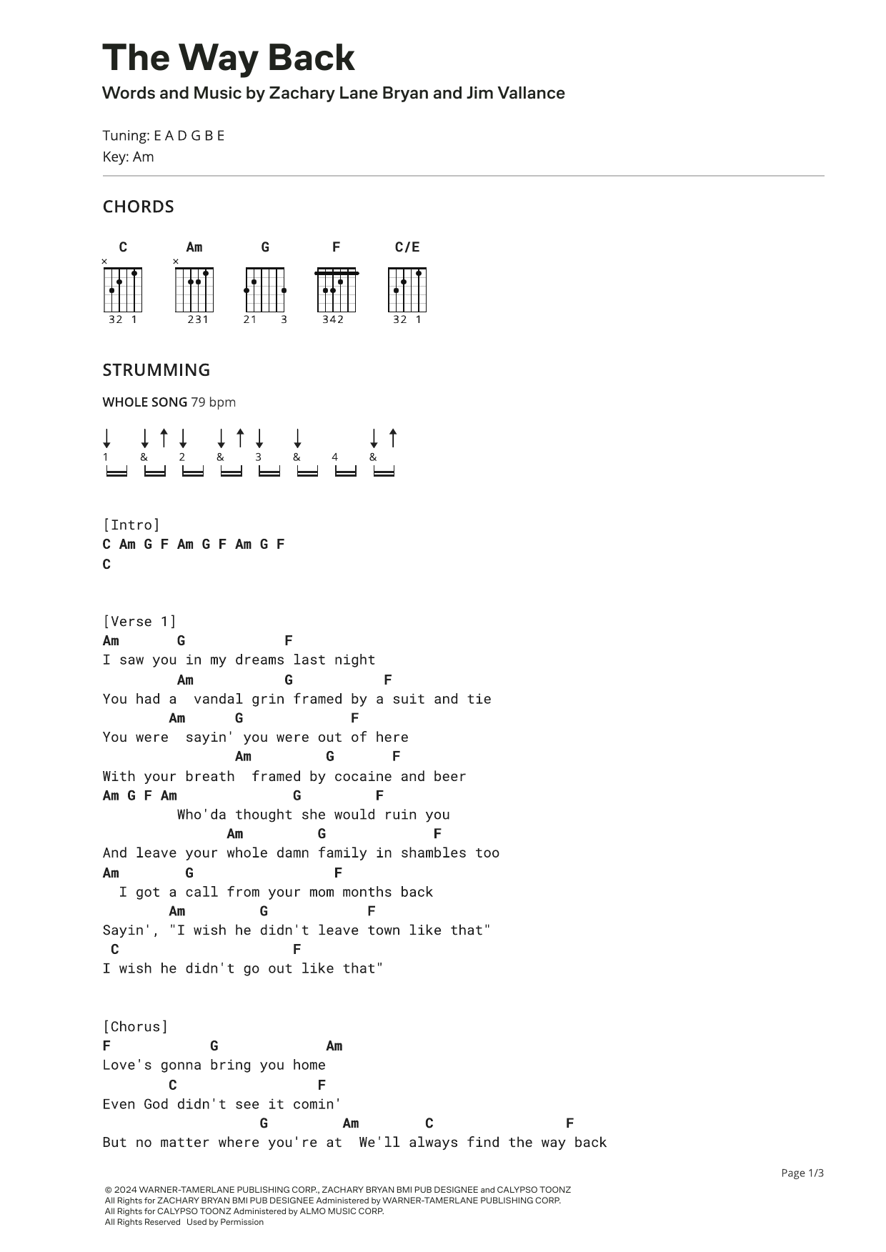 Download or print Zach Bryan The Way Back sheet music, chords and digital score arranged for Ultimate Guitar. This Country score includes 3 page(s).