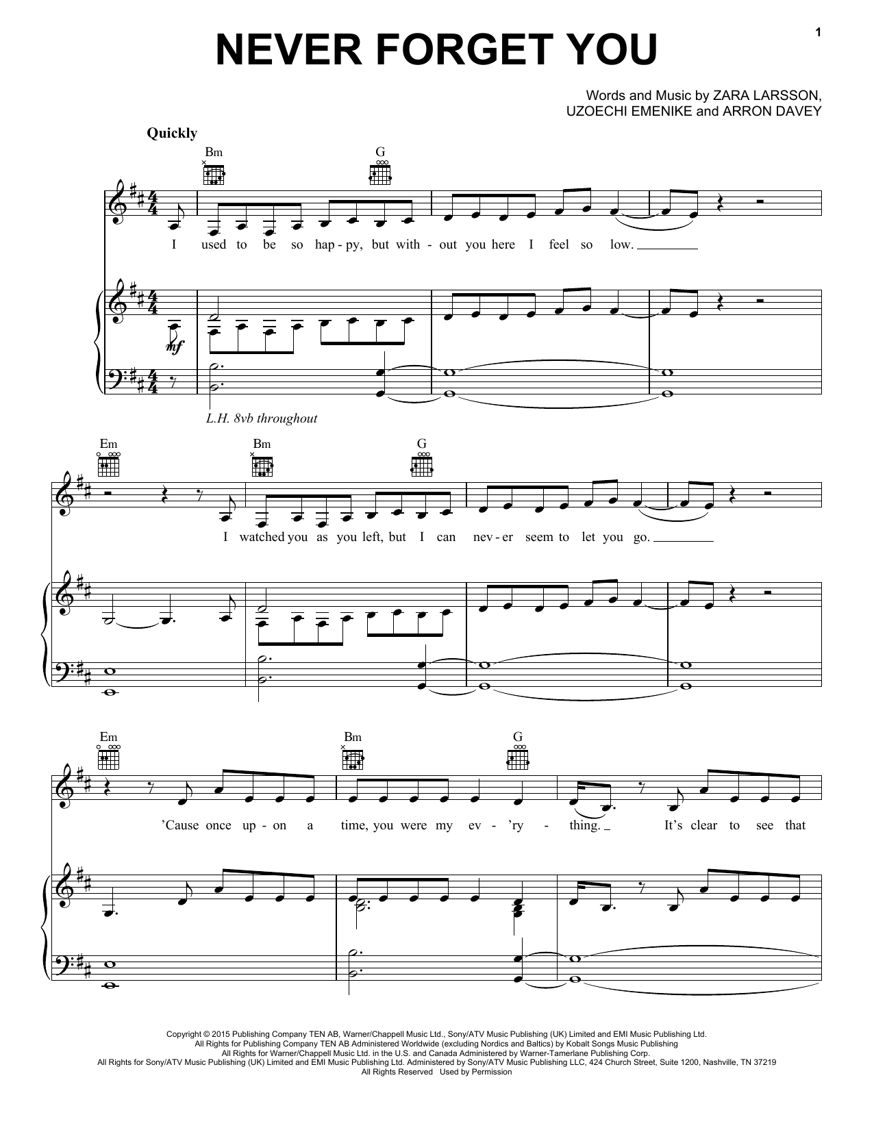 Download or print Zara Larsson & MNEK Never Forget You sheet music, chords and digital score arranged for Piano, Vocal & Guitar Chords (Right-Hand Melody). This Pop score includes 9 page(s).