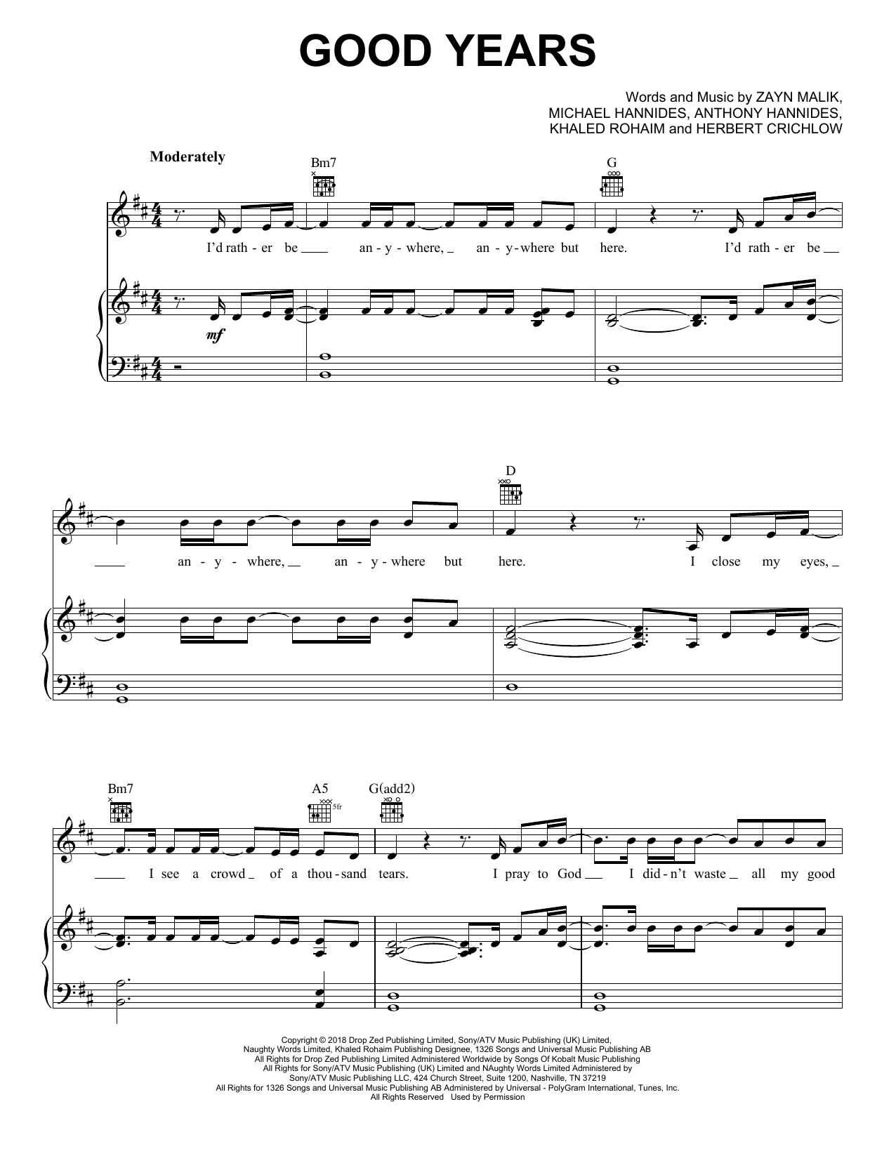 Download or print Zayn Good Years sheet music, chords and digital score arranged for Piano, Vocal & Guitar Chords (Right-Hand Melody). This Pop score includes 5 page(s).