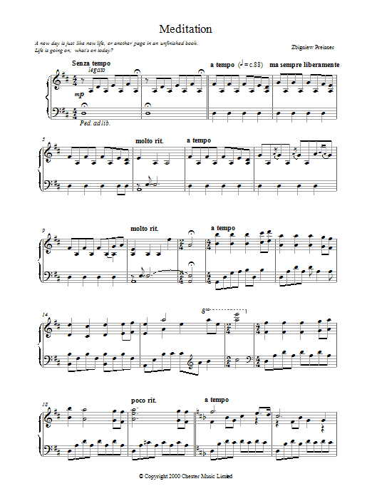 Download or print Zbigniew Preisner Meditation sheet music, chords and digital score arranged for Piano Solo. This Classical score includes 6 page(s).