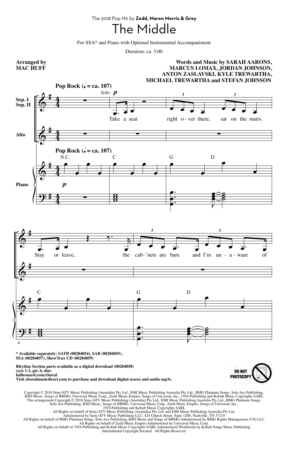 Download or print Zedd, Maren Morris & Grey The Middle (arr. Mac Huff) sheet music, chords and digital score arranged for SSA Choir. This Pop score includes 11 page(s).