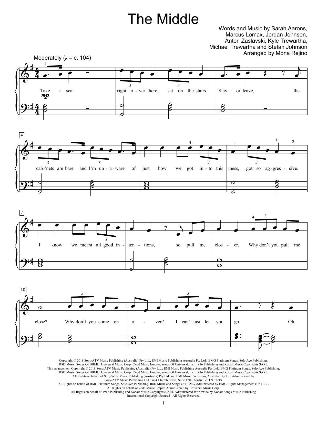 Download or print Zedd, Maren Morris & Grey The Middle (arr. Mona Rejino) sheet music, chords and digital score arranged for Educational Piano. This Pop score includes 5 page(s).