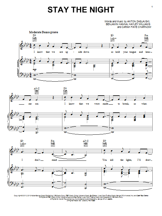 Download or print Zedd Stay The Night sheet music, chords and digital score arranged for Piano, Vocal & Guitar Chords (Right-Hand Melody). This Pop score includes 8 page(s).