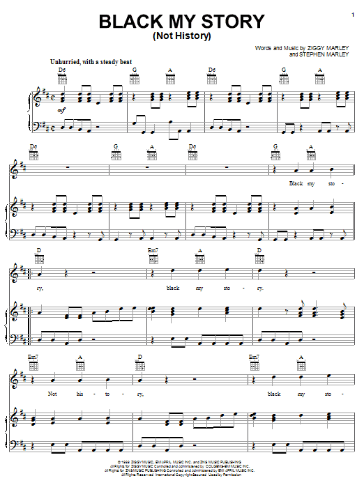 Download or print Ziggy Marley Black My Story (Not History) sheet music, chords and digital score arranged for Piano, Vocal & Guitar Chords (Right-Hand Melody). This Pop score includes 7 page(s).