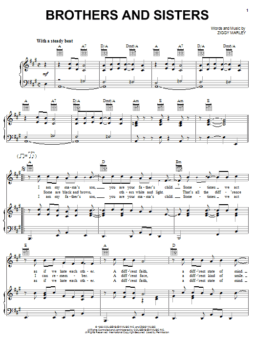 Download or print Ziggy Marley Brothers And Sisters sheet music, chords and digital score arranged for Piano, Vocal & Guitar Chords (Right-Hand Melody). This Pop score includes 5 page(s).