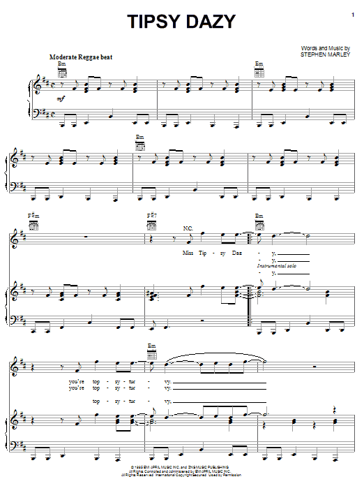 Download or print Ziggy Marley Tipsy Dazy sheet music, chords and digital score arranged for Piano, Vocal & Guitar Chords (Right-Hand Melody). This Pop score includes 5 page(s).