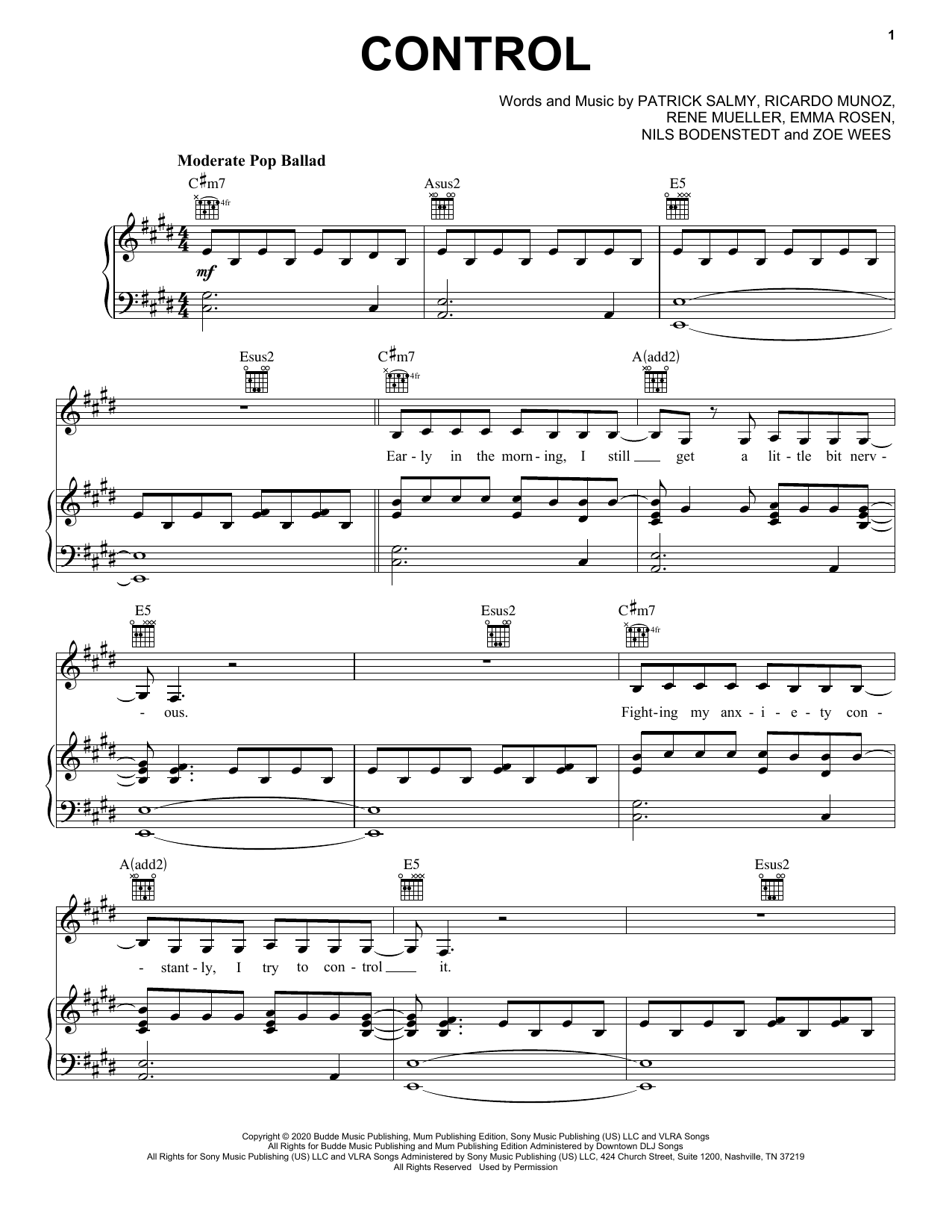 Download or print Zoe Wees Control sheet music, chords and digital score arranged for Piano, Vocal & Guitar Chords (Right-Hand Melody). This Pop score includes 8 page(s).