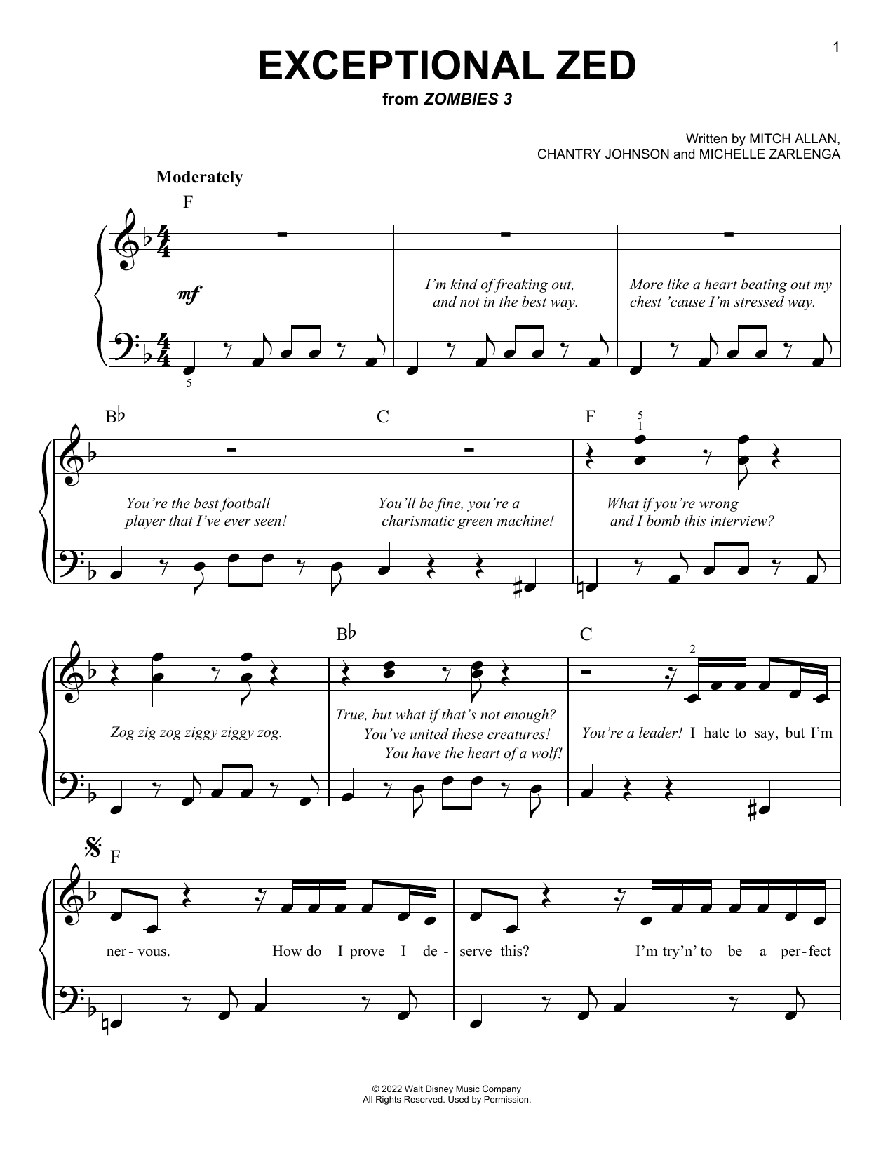 Download or print Zombies Cast Exceptional Zed (from Disney's Zombies 3) sheet music, chords and digital score arranged for Easy Piano. This Disney score includes 5 page(s).