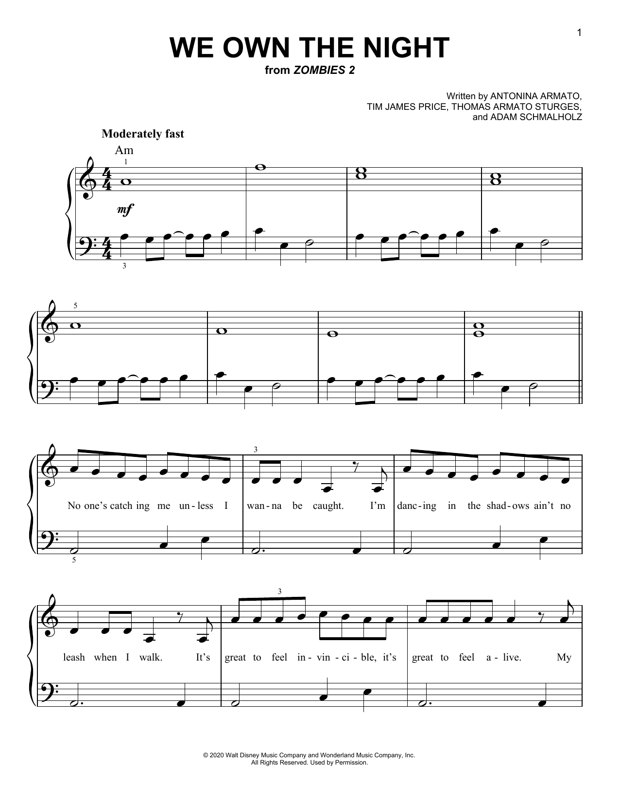 Download or print Zombies Cast We Own The Night (from Disney's Zombies 2) sheet music, chords and digital score arranged for Easy Piano. This Disney score includes 5 page(s).