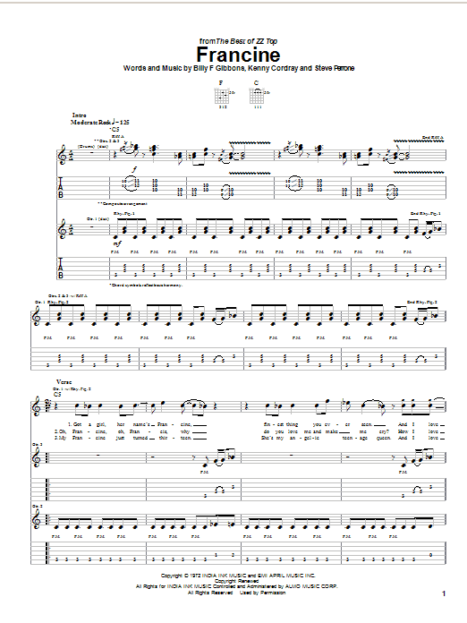 Download or print ZZ Top Francine sheet music, chords and digital score arranged for Piano, Vocal & Guitar Chords (Right-Hand Melody). This Blues score includes 3 page(s).