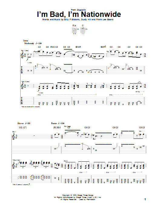 Download or print ZZ Top I'm Bad, I'm Nationwide sheet music, chords and digital score arranged for Guitar Tab. This Blues score includes 14 page(s).