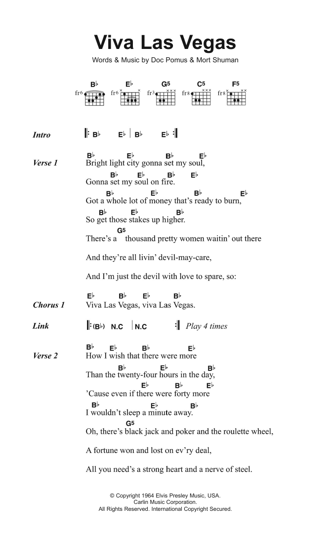 Download or print ZZ Top Viva Las Vegas sheet music, chords and digital score arranged for Guitar Chords/Lyrics. This Pop score includes 3 page(s).